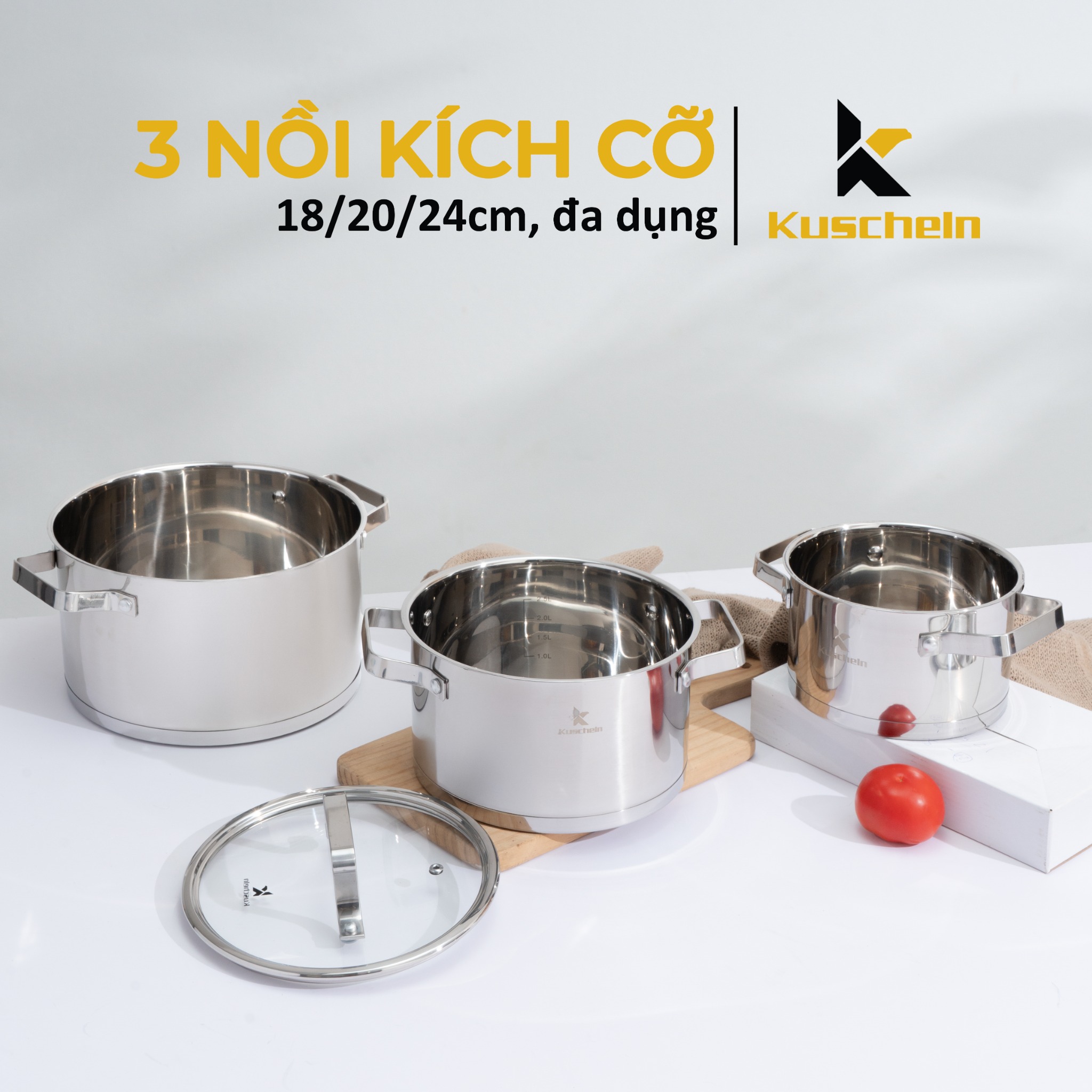 - Sản phẩm dùng được được trên mọi loại bếp và đáp ứng tốt nhu cầu sử dụng tại gia đình. Bộ nồi có 3 loại kích cỡ: Φ18cm/20cm/24cm, sử dụng được cho nhiều mục đích nấu ăn khác nhau.