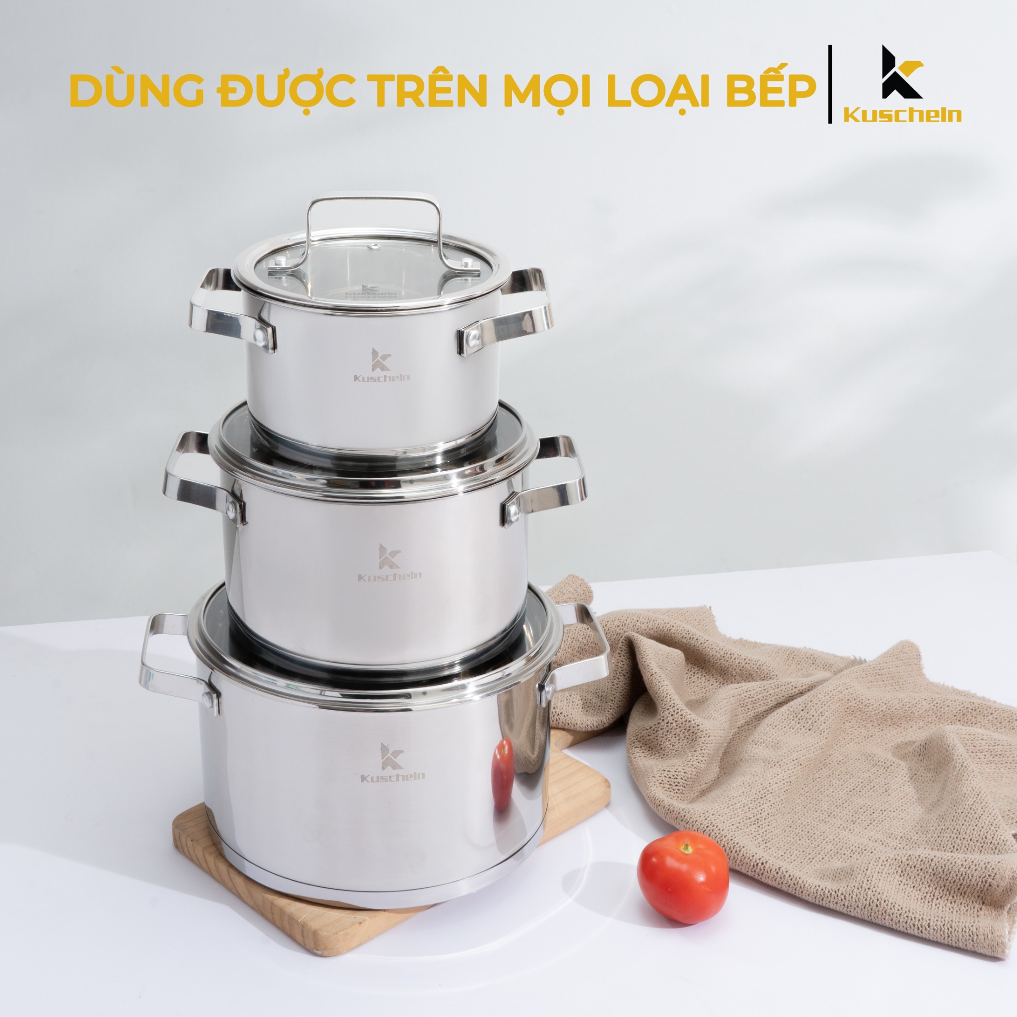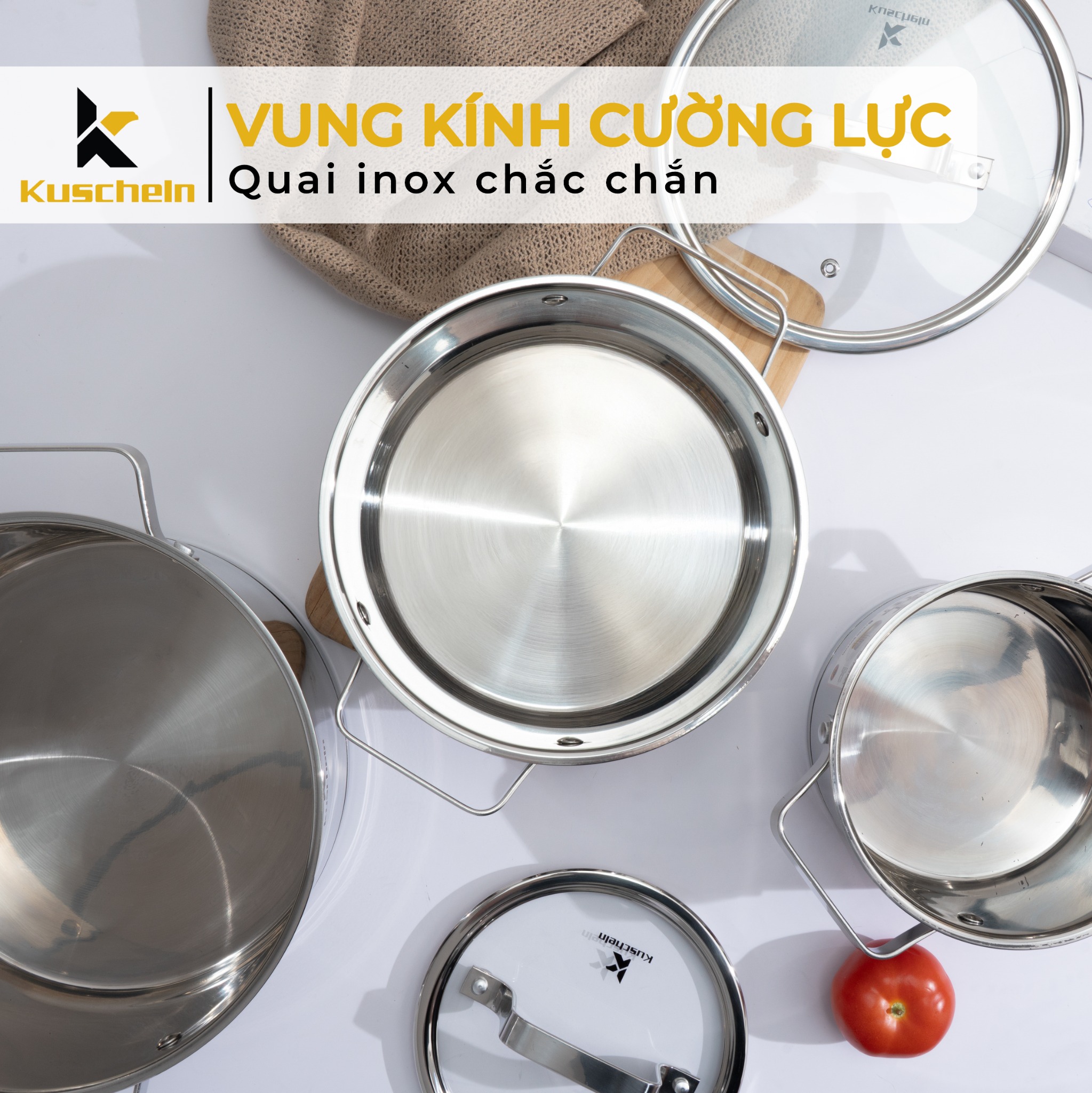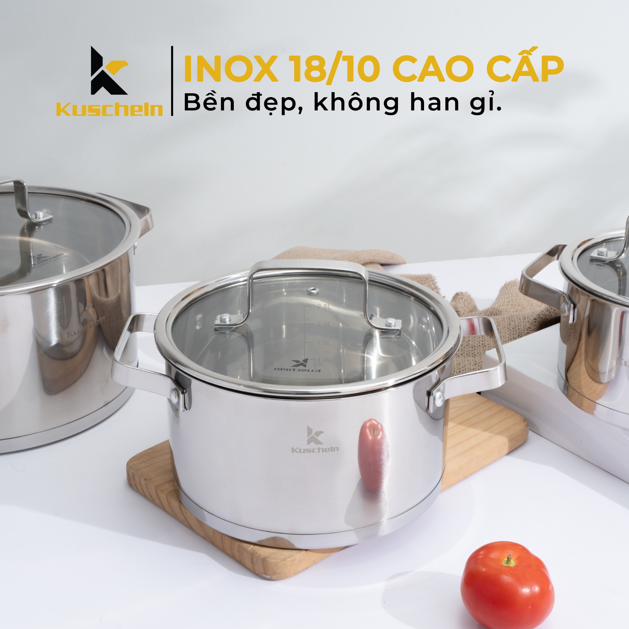 - Bộ nồi inox 5 đáy Kuscheln KPS053-5D được làm bằng chất liệu inox 18/10 cao cấp, không bị oxy hóa, kiểu dáng đẹp mắt, vung kính trong suốt, quai núm bằng inox bền đẹp, không han gỉ.