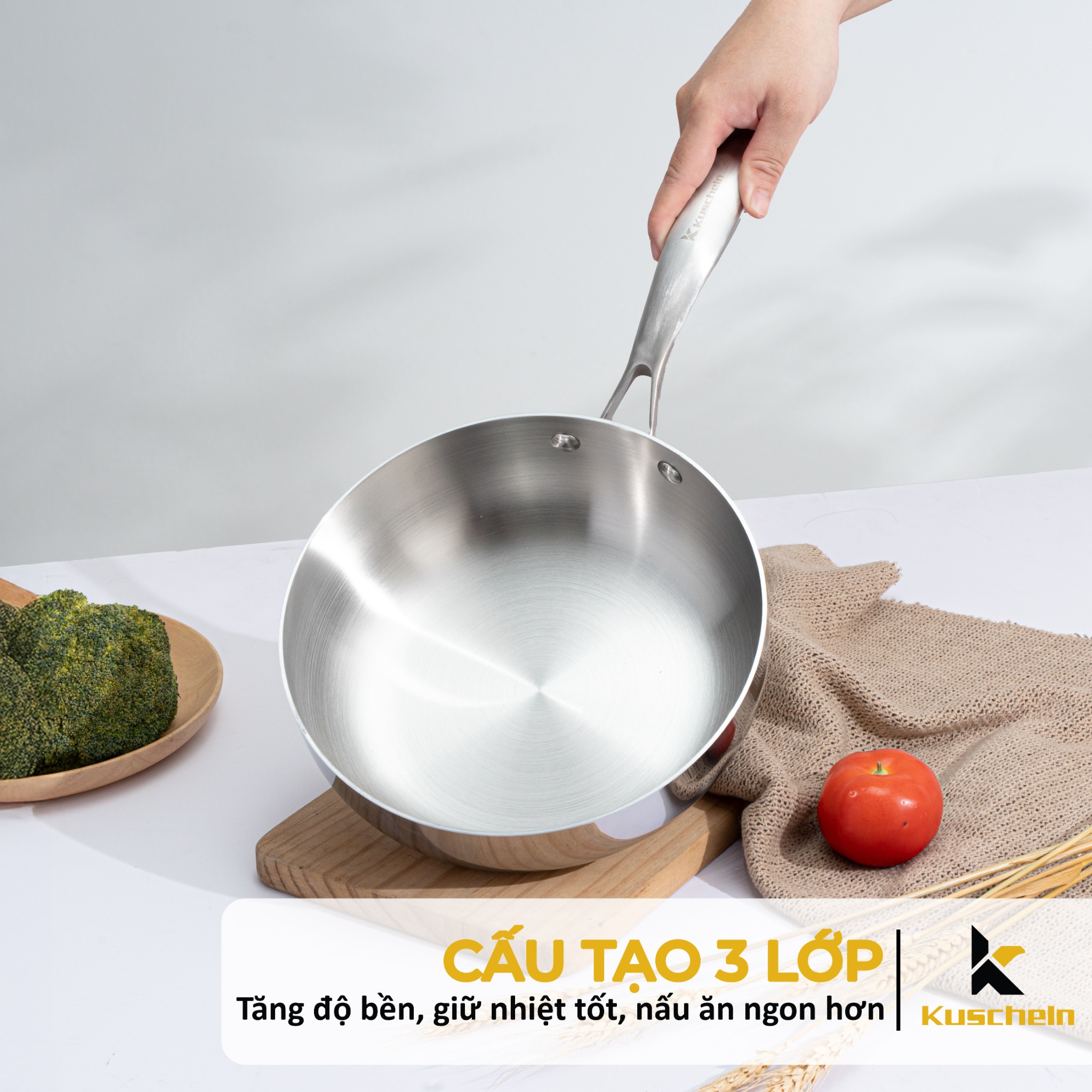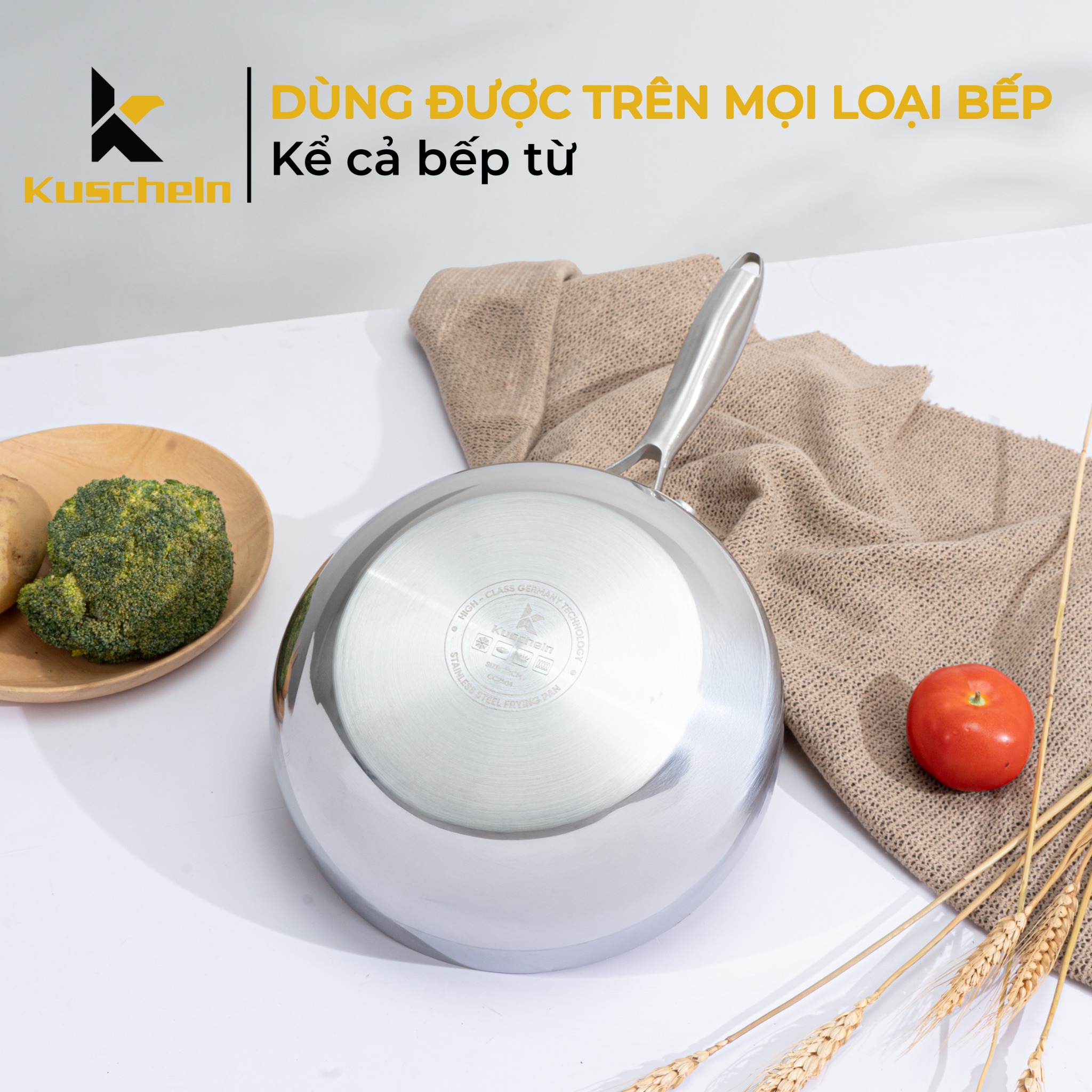 - Lớp trong của chảo là lớp inox chống dính tự thân 304, sản phẩm dùng trên mọi loại bếp