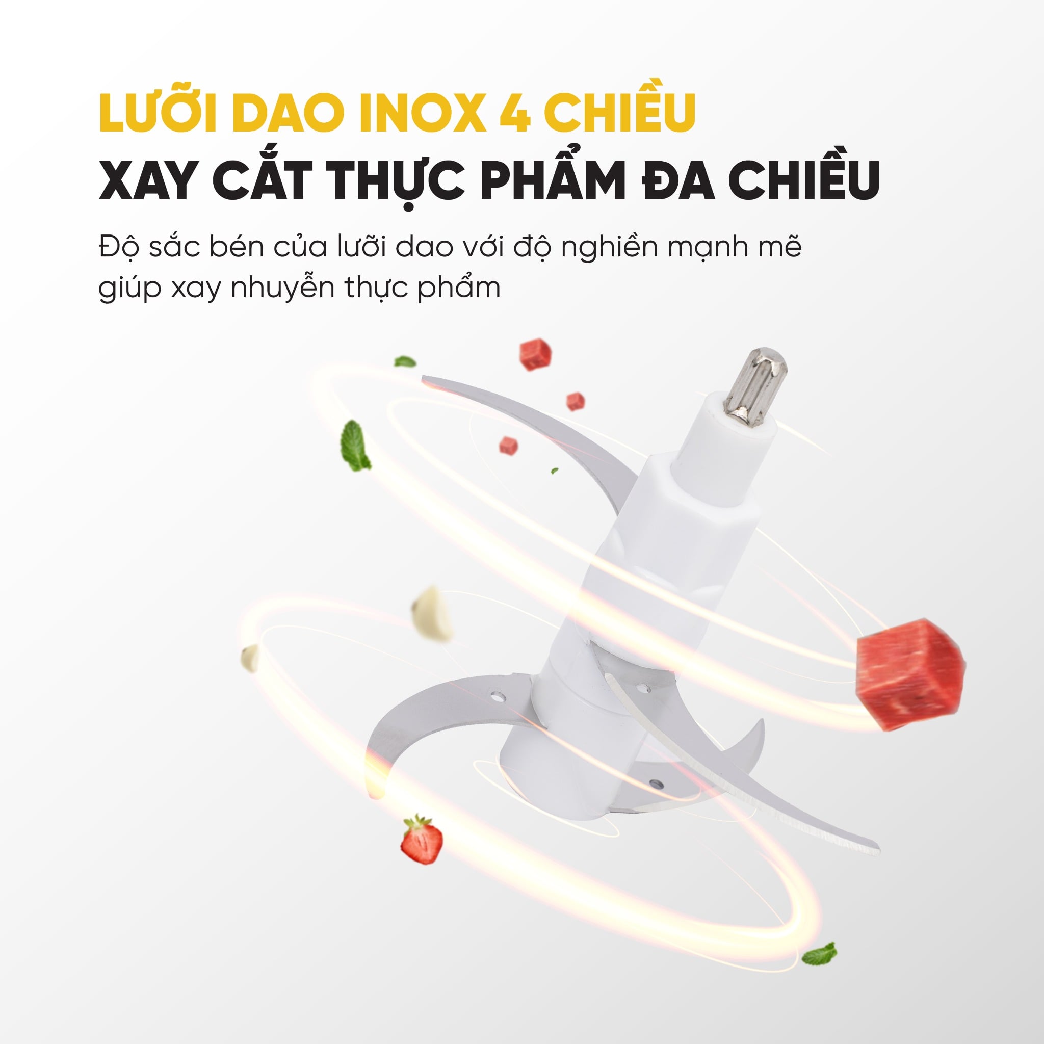 4 lưỡi dao sắc bén được làm bằng inox 420, không gỉ, xay nhuyễn thịt và các loại ra củ khác một cách nhanh chóng.