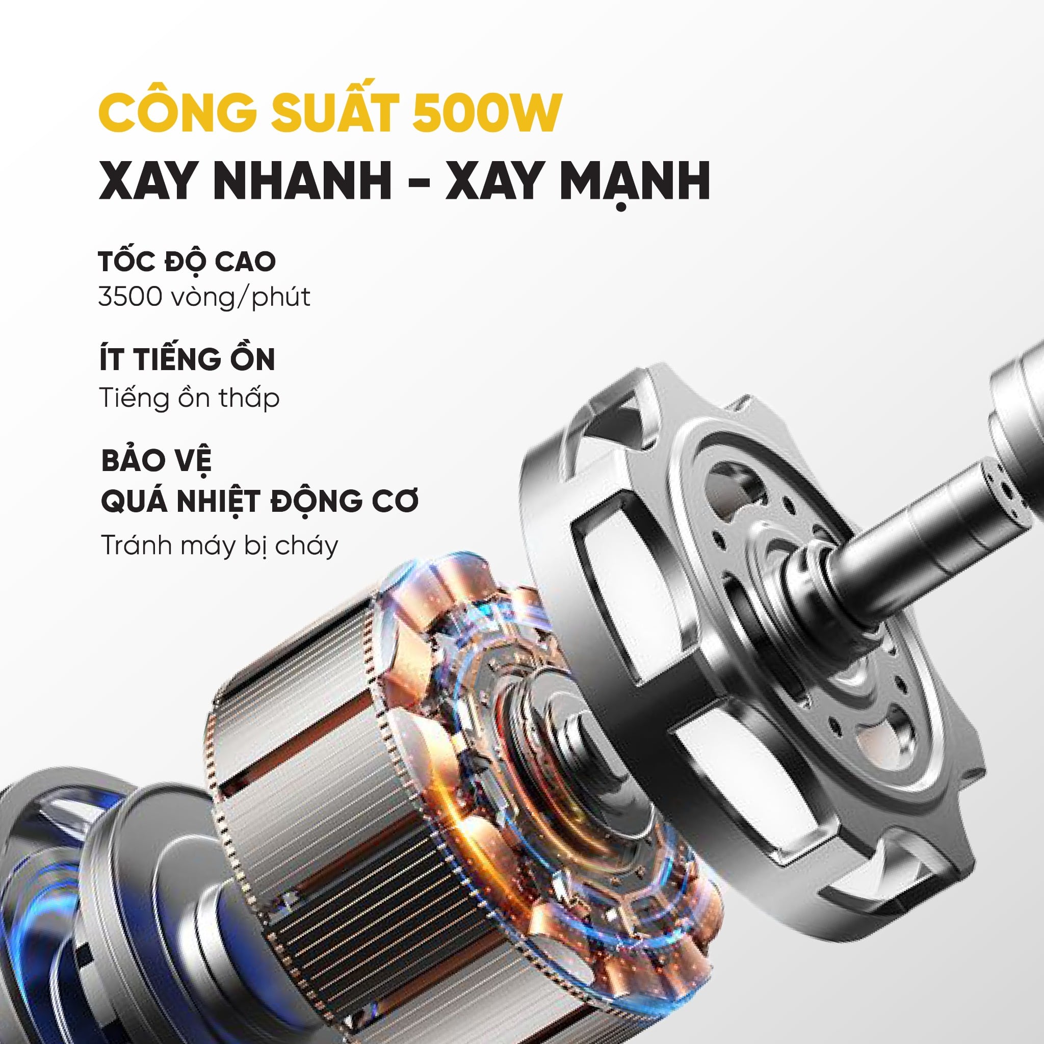 Máy có công suất 500W mạnh mẽ cùng động cơ đồng nguyên chất, giúp xay nhuyễn thịt và mọi loại thực phẩm một cách dễ dàng, tiết kiệm thời gian và công sức của người dùng.
