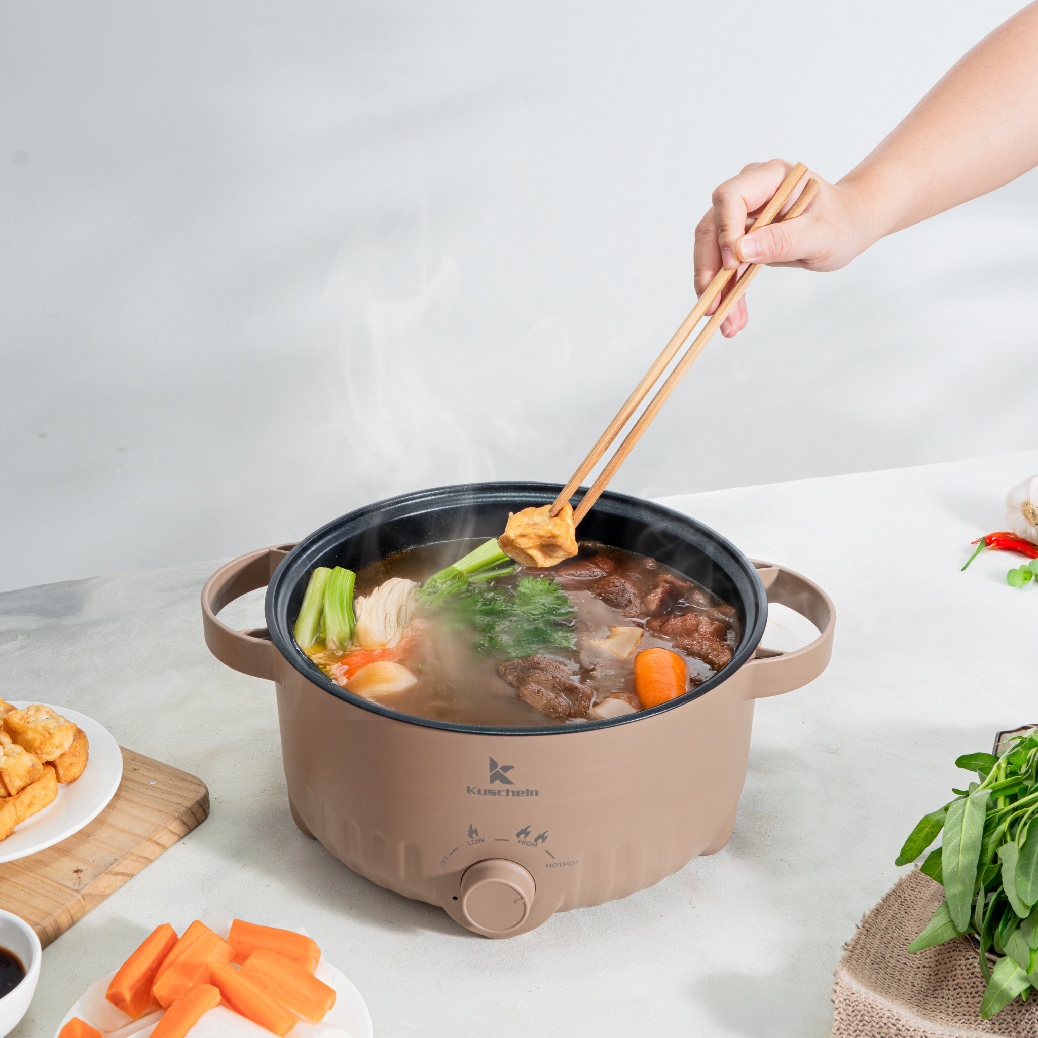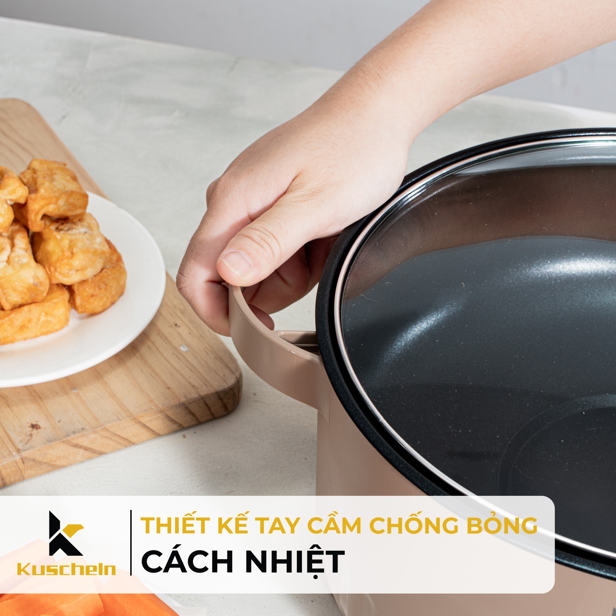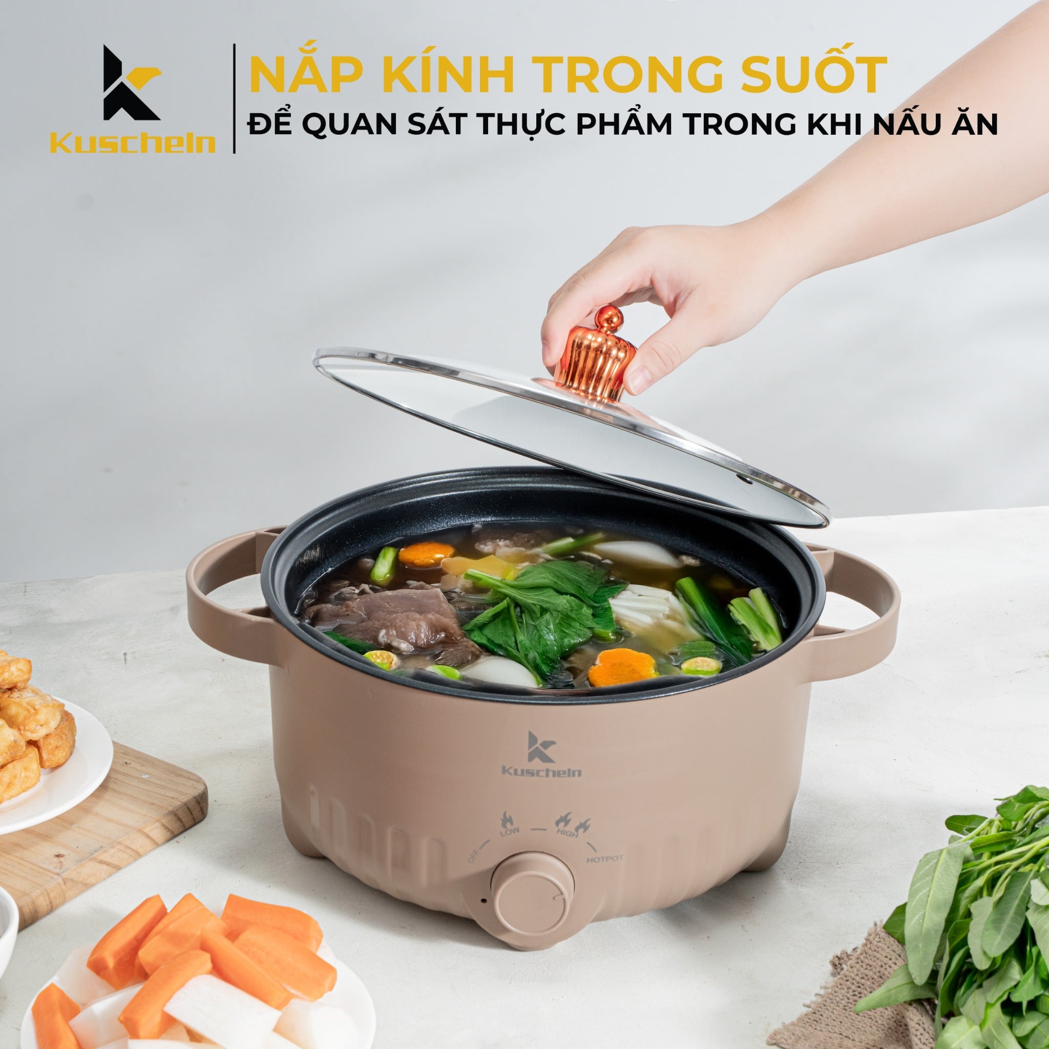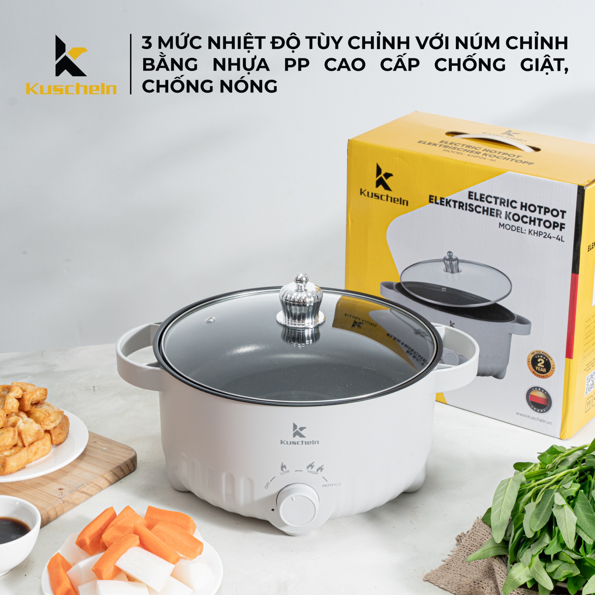 Nồi lẩu điện KHP24-4L công suất 1000W, điện áp 220V-240V, vỏ nhựa ABS chịu nhiệt. Với lòng nồi hợp kim nhôm phủ chống dính và vung kính cường lực, sản phẩm thích hợp cho các bữa tiệc lẩu gia đình.